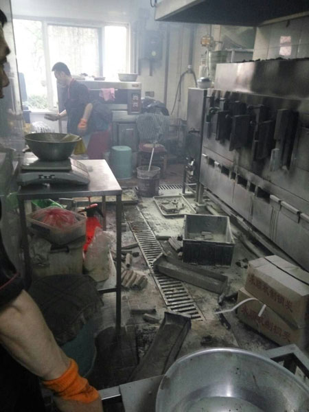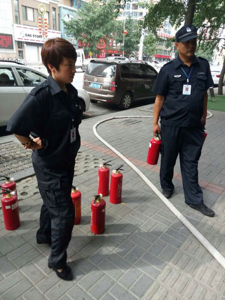 7月29日15時左右,金海物業(yè)江畔花園管理部當值保安班長趙丹巡視至57樓時,突然發(fā)現(xiàn)樓下飄過陣陣濃煙。當確定這股濃煙是來自57號樓外臨街門市一烤魚店,里面發(fā)生火情后,趙丹立即用對講機通知了管理部及49號崗、60號崗的值班保安。隨后,趙丹火速帶領保安楚兆強、張代秋,管理員孫海燕和熱心業(yè)主曲師傅,拎著滅火器趕到烤魚店。