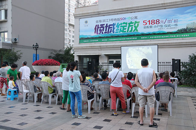 經(jīng)營(yíng)中心置業(yè)顧問(wèn)也在現(xiàn)場(chǎng)給觀看電影人員贈(zèng)送電影兌換券,此兌換券可以到濱江3號(hào)售樓處兌換電影票一張。