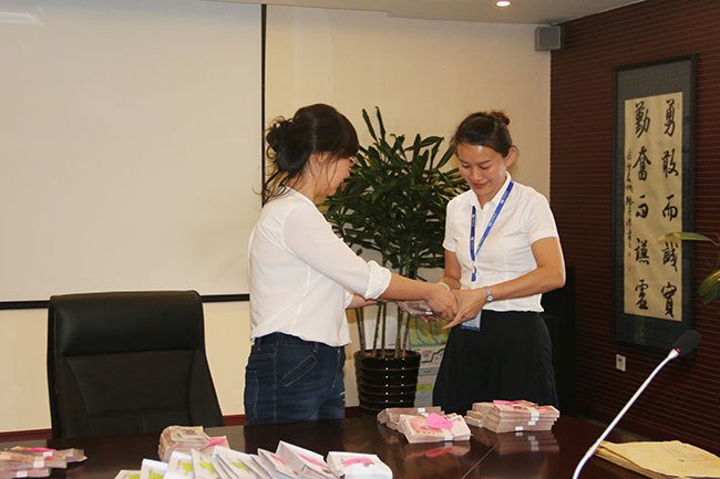 9月8日下午,經(jīng)營中心宣布召開銷售會議,會議由集團常務(wù)副總經(jīng)理莫丹主持,濱江3號、溫泉小鎮(zhèn)、金海瀾山全體銷售人員參與會議,就在大家準備認真做好記錄的時候,呈現(xiàn)在大家面前的是幾十萬元的現(xiàn)金。