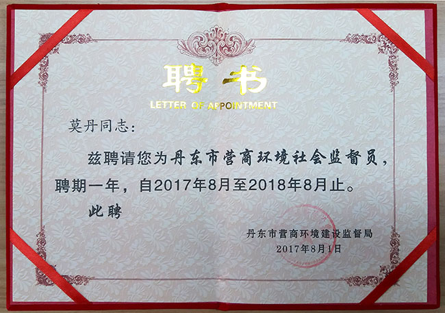 遼寧金海集團總經理莫丹被聘請為丹東市營商環(huán)境社會監(jiān)督員