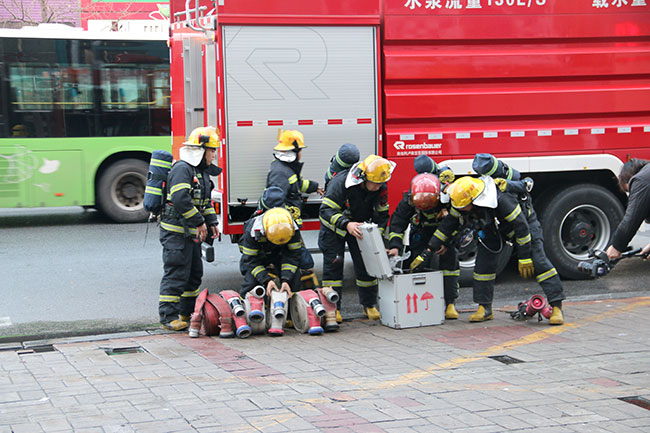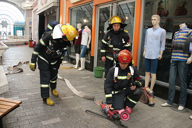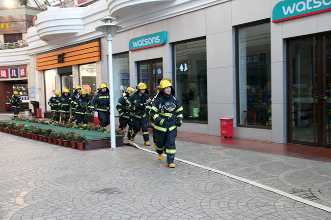 本次演練消防隊(duì)出動(dòng)四個(gè)中隊(duì)50名消防官兵參加,分別通過女人街東、西門進(jìn)入商場(chǎng),在商場(chǎng)一二樓中央舞臺(tái)區(qū)域出動(dòng)消防車供水滅火管道4條、消防水炮4個(gè)、消防水槍4只進(jìn)行火場(chǎng)撲救,另準(zhǔn)備應(yīng)急排煙設(shè)備、強(qiáng)拆設(shè)備、應(yīng)急人員救援設(shè)備。