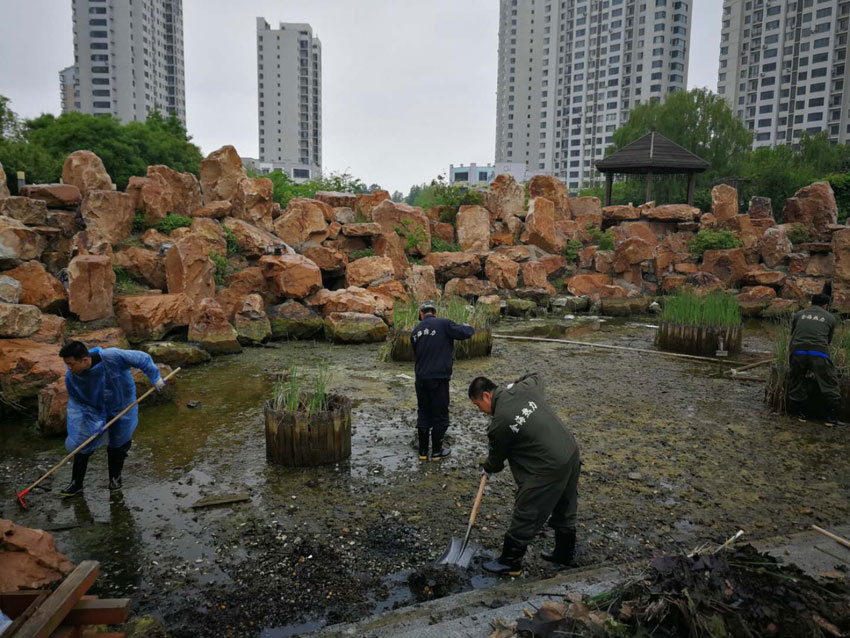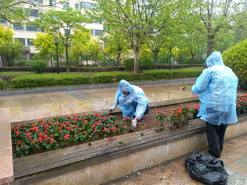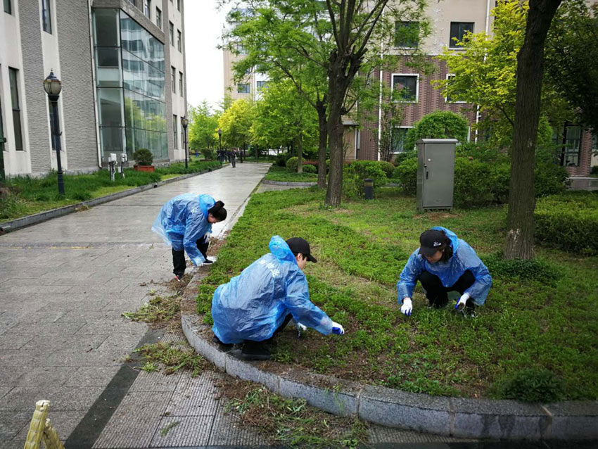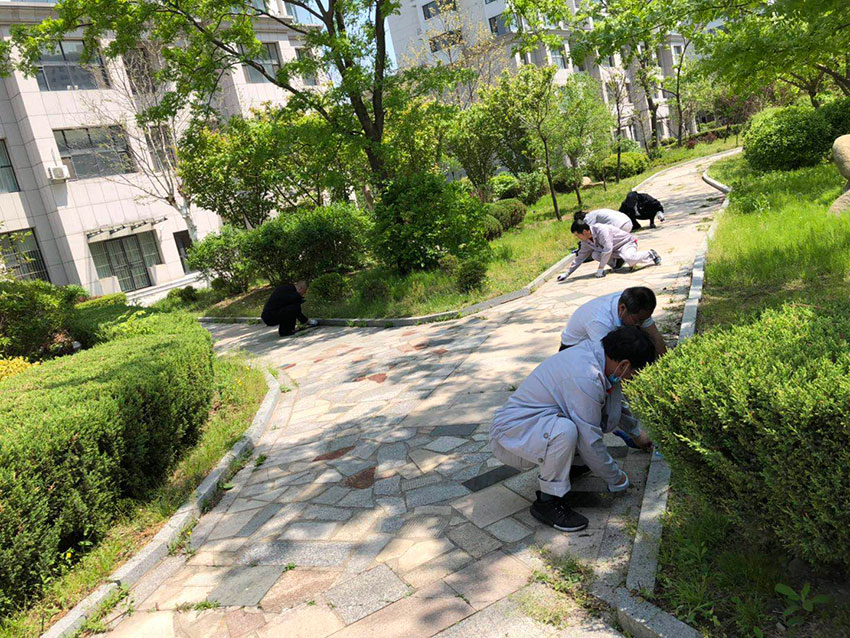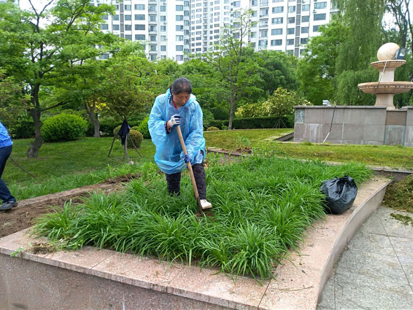金海員工們劃片分區(qū),各領任務,迅速投入園區(qū)清掃、園林拔草、園林維護各項緊張勞動當中。