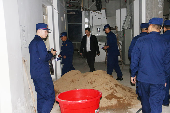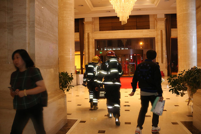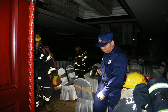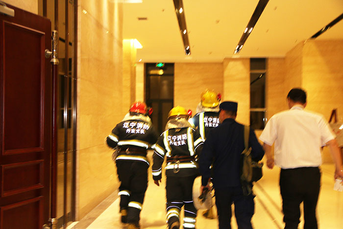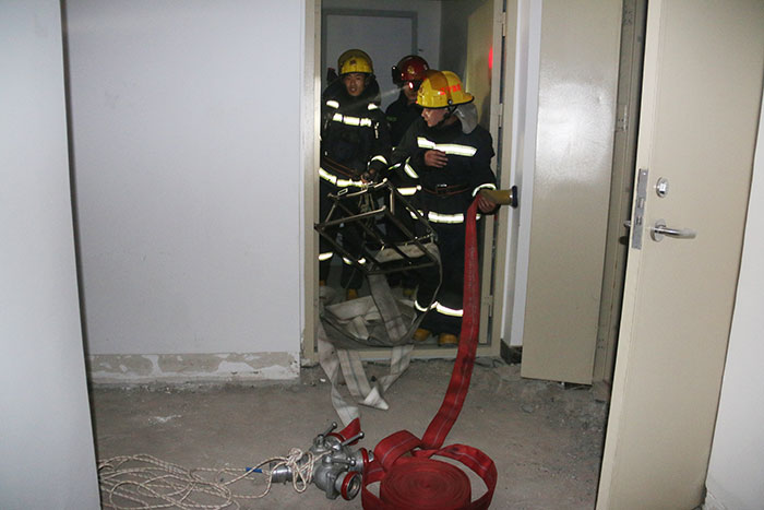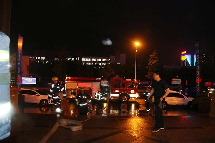 晚上8點演練在大廈門口正式開始,現(xiàn)場總指揮由消防救援支隊參謀長趙凱特、指揮長王永旭全程指揮,演練共分為:室內(nèi)救援、高層布設(shè)水袋、高空救援等課目。