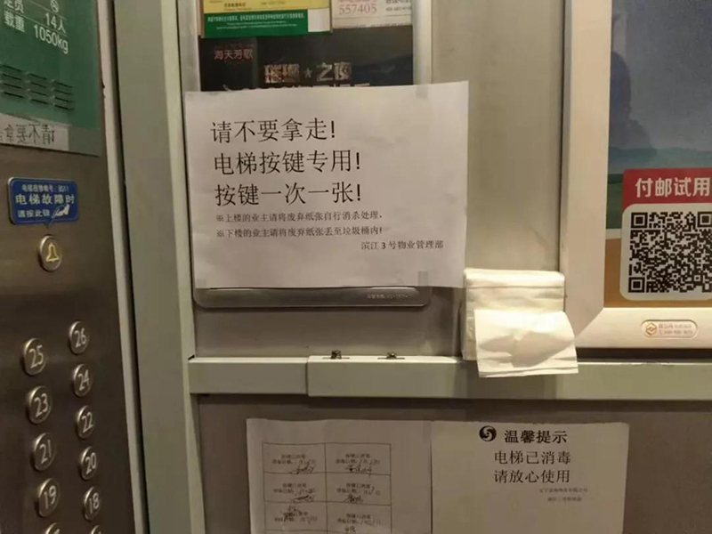 各管理部在電梯內(nèi)提供免費(fèi)的紙抽供業(yè)主按電梯使用,不放過任何一個(gè)可能滋生病毒的角落。