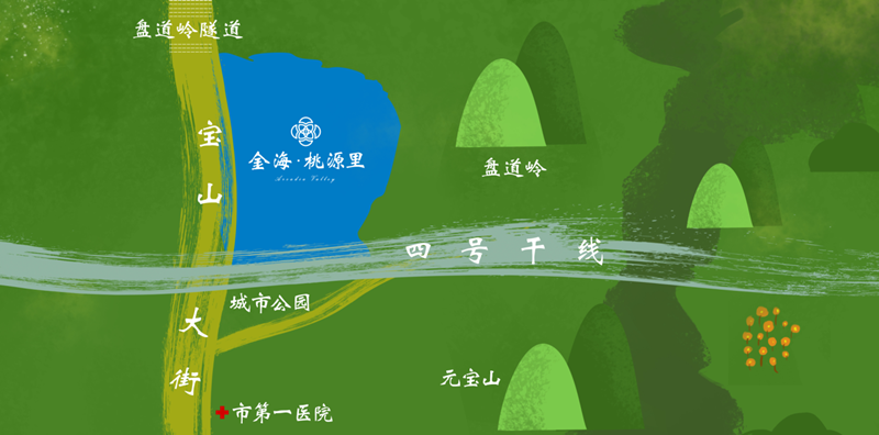 金海·桃源里,連接著元寶山,青山秀巒,鳥語花香。山體綠化、臺式綠化將是重要景觀亮點。未來的景觀帶,潺潺的流水,風景宜人。
