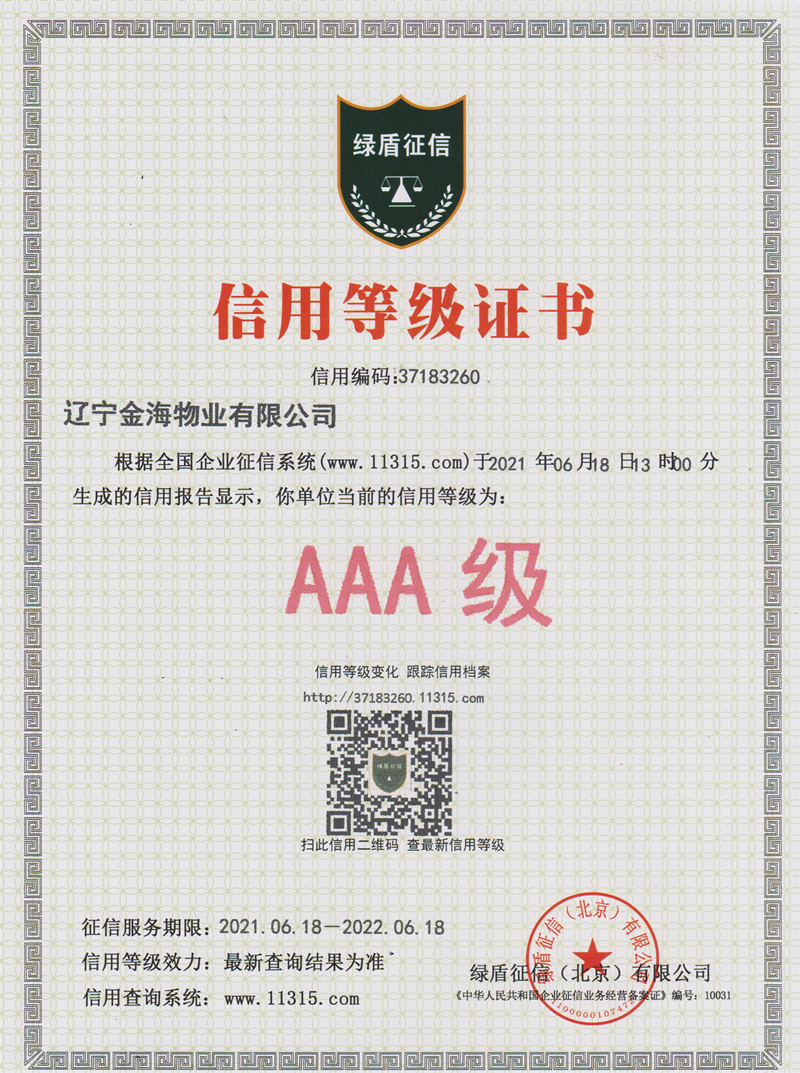 根據(jù)全國企業(yè)征信系統(tǒng)于2021年6月18日生成的信用報告顯示,遼寧金海物業(yè)有限公司榮獲“AAA級信用等級”。