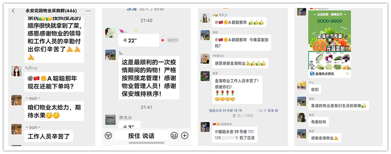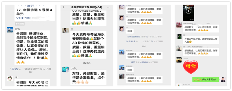 “疫情當(dāng)下,物業(yè)主動(dòng)為業(yè)主采購(gòu)蔬菜包,不僅價(jià)格便宜,還特別的新鮮,真的非常感謝!”“家里斷糧了,送的太及時(shí)了!”“家里只有老兩口,行動(dòng)不便,感謝金海想著我們”“感謝物業(yè)辛苦送菜”……暖心之舉也讓業(yè)主群里頓時(shí)熱鬧了起來(lái),點(diǎn)贊的聲音比比皆是。有的業(yè)主心疼工作人員,也紛紛送來(lái)自家的物資及食物,新鮮的蔬菜,愛(ài)心的“投喂”,在嚴(yán)峻的疫情下,依舊流動(dòng)著暖暖的溫情。