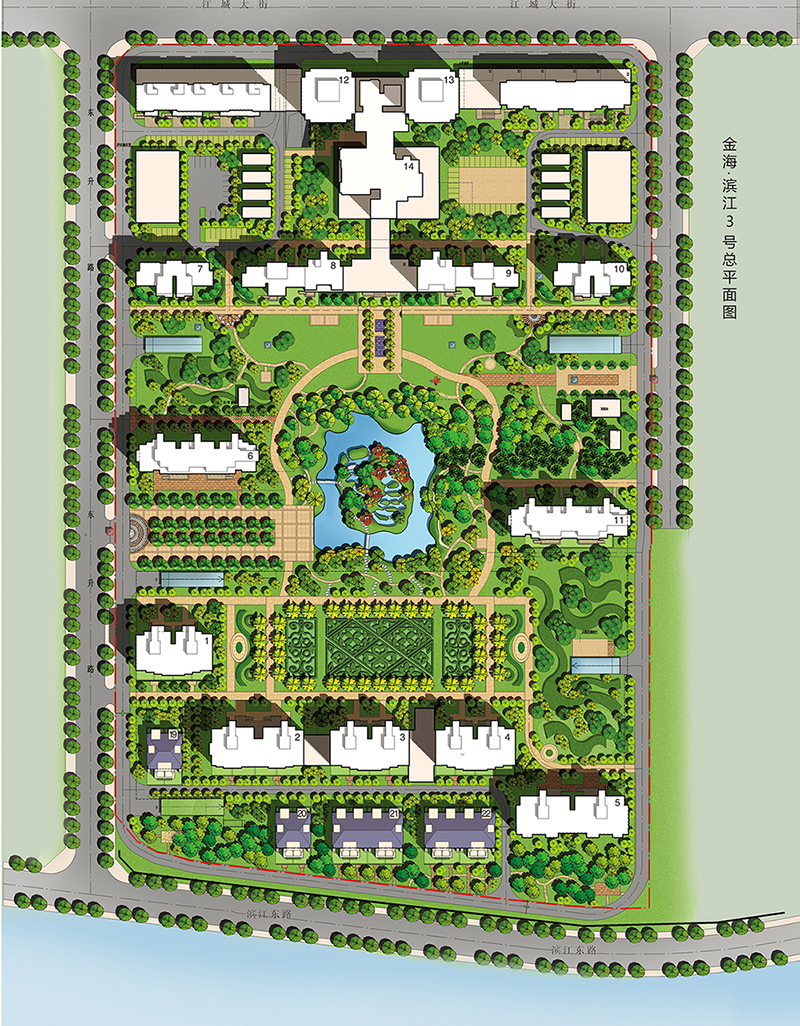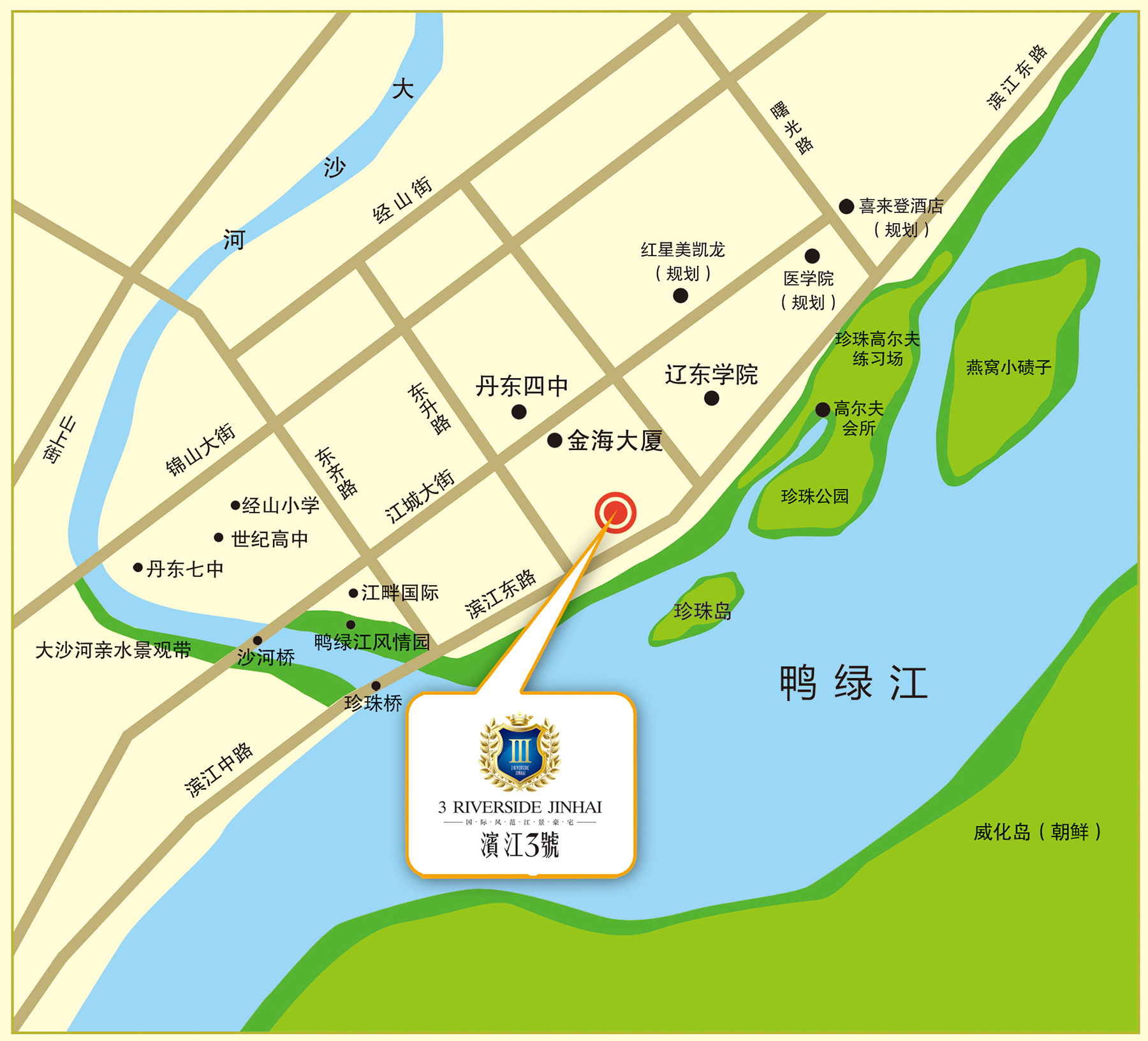 金?!I江 3 號,2010 年 11 月開工,2014 年 7 月竣工。位于丹東鴨綠江畔,總建筑面積 36 萬平方米。項目按金海全新生活方式理念開發(fā),由美國約翰遜·費恩設計事務所和深圳、大連規(guī)劃設計部門參與總體規(guī)劃,大連建筑設計研究院設計,北京六建和南通三建施工,成為倡導健康、尊崇養(yǎng)老、注重生態(tài)的全新生活方式住區(qū)。